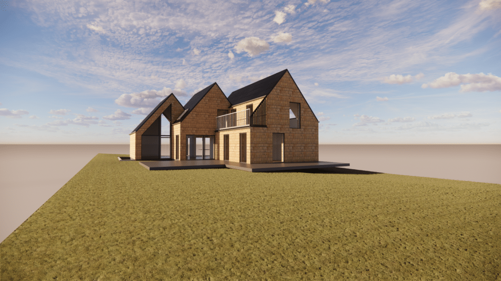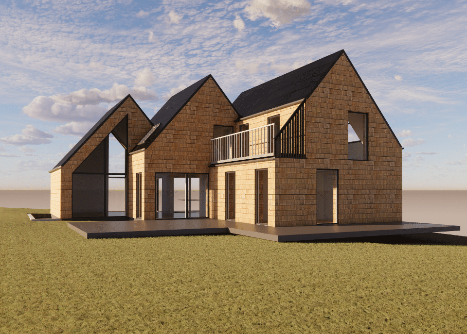 Villaen er designet med bæredygtighed som gennemgående tema, hvor der i vid udstrækning anvendes trækonstruktioner og hampefiberisolering. Projektet inkluderer også installation af solartag og et målrettet arbejde for at minimere brugen af andre byggematerialer end træ.